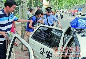 8日中午,一位考生在同学的帮助下走出山师附中考点,看到考生不适,巡警送考生回家。 本报记者 左庆 摄