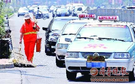 6月8日中午,骄阳似火。车流中,一名身穿橘红色标志服的女清洁工在清扫路面。橘红色的身影格外亮丽。 本报记者 徐延春 摄