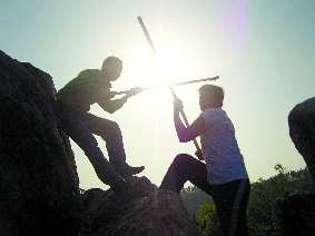 作品描述:迎着朝阳登山,父子嬉戏其乐融融。