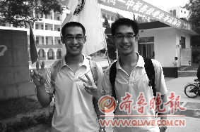 7日上午11点半,一对长相极似的男孩走出威海一中考点,引起记者注意。记者猜测这是一对双胞胎,上前一问果然。哥哥叫尚凯,弟弟叫尚旋。“父母给我们起的名字寓意很明显,就是希望我们这次高考能凯旋而归。”尚凯开玩笑说。尚凯说他总是掌握着话语权,充当兄弟中的“发言人”。
