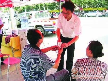 6月8日下午3点,考生家长们坐在免费饮用水供应处和休息站点,工作人员为家长们送上饮用水。
