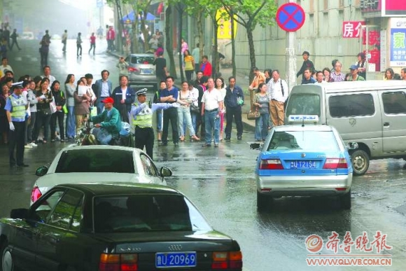 8日下午,在青岛15中考点外,家长排起人墙堵路,交警只能指挥途经车辆绕行。本报记者 杨宁 张晓鹏 摄影报道