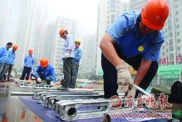 8日,在永吉路附近一广场上,青岛热电集团公司的工人师傅们在进行暖气片、管道等组装检修专业技能比拼。据介绍,为迎接夏季用电高峰的到来,青岛热电集团公司组织一线工作人员加强技能培训,确保供电顺畅。本报记者 张晓鹏 摄影报道