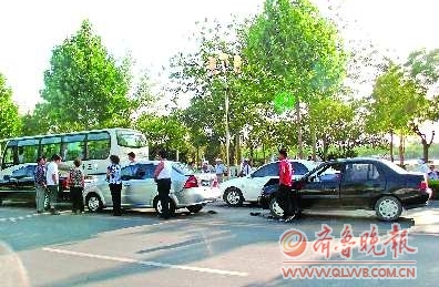 8日下午5点多,湖滨大道中心广场段三车连环追尾。据现场群众反映,一辆黑色的轿车突然撞上了前面的银色轿车,并推着银色轿车撞上了前面等红灯的黑色轿车,所幸没有人员受伤。 本报记者 牟张涛 董传同 摄影报道
