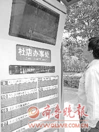 6日,之前安装于黄河二路的电子智能站牌正式测试开通,电子显示屏、语音提示器都开始正常运行。图为一位乘客在电子智能站牌前等车,可以清楚地看到站牌上正在提示某辆公交车距离杜店办事处还有4站。