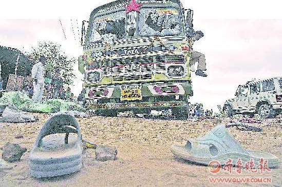 6月9日,在印度古吉拉特邦最大城市艾哈迈达巴德附近的公路上,人们站在肇事卡车旁。当天凌晨,一辆高速行驶的卡车在印度西部一条公路上碾死至少18名夜宿街头的朝觐者,另有10人受伤。