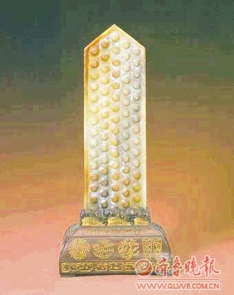 明,高21.3cm,宽6.3cm,厚0.9cm。清宫旧藏。玉圭表面有旧色,厚片状,顶部有凸起的圭角。两面饰纹相同,为5列凸起的谷纹。圭下部呈方形,插入饰填金纹饰的紫檀木座中。木座顶部雕海水江崖,其下刻阴线夔龙纹,座四面共饰12组图案,为古代的“十二章”。插圭处的凹槽内刻有“大清乾隆年制”六字款。此种谷圭在明代墓葬中发现多件,为贵族妇女身上的装饰。玉圭的木座为清代宫廷所制。