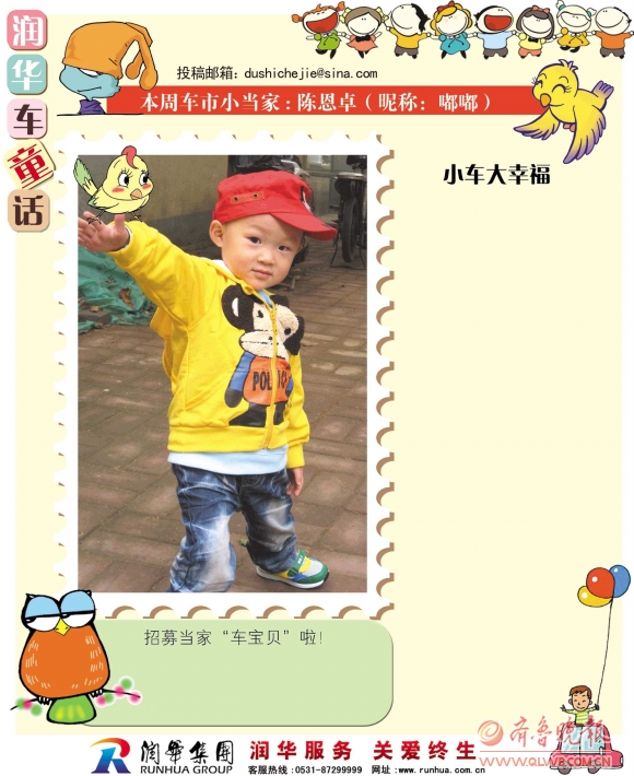 本栏目报名要求———1、宝宝照片:儿童彩色单人照,写真照片为佳。2、宝宝档案:包括宝宝姓名、昵称、年龄、兴趣爱好等内容,字数在200字以内。3、宝宝与车的故事:以第一人称讲述宝宝的“汽车观”或汽车趣事,字数在200字以内。投稿邮箱:dushichejie@sina.com(注:来稿请注明“车市小当家”)