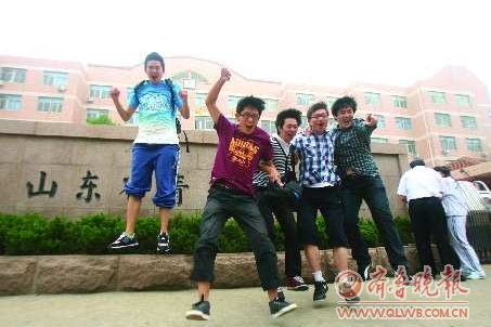 9日中午,高考结束。在青岛1中考点,刚刚走出考场的学生兴奋地跳起来,合影留念。