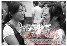 ▲在青岛15中考点,考试结束,一名考生收到家长送的鲜花惊喜不已。本报记者 张晓鹏 杨宁 摄