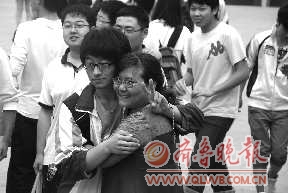▲在15中考点,考试结束,一名老师跟学生拥抱在一起。本报记者 张晓鹏 杨宁摄