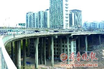 作品描述:重庆市江北五里店立交桥桥下,有一栋楼房在此,实属少见。投给烟台的拍客
