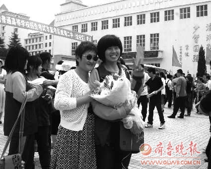 高考结束,很多考生家长为考生送来鲜花表示祝贺。