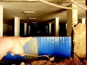 9日,在泰华白浪河假日广场项目施工现场,越过围挡,记者便望到了河对面西口V1广场地下停车场处的灯光。