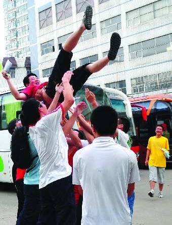 6月9日上午,高考最后一场考试结束后,临沂一中高三十五班的学生将班主任高高抛起,彻底放松心情。
