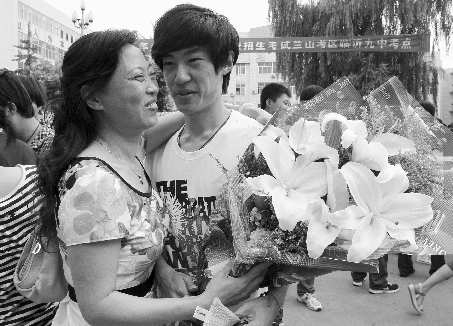 9日,最后一场考试结束后,一名在临沂九中考点场外等待的母亲给孩子递上一束鲜花。