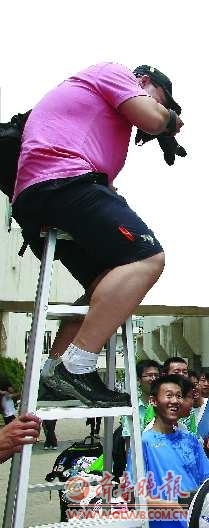 ←6月9日,在枣庄三中东校考点,一名摄影师为追求独特视角,专程扛来了一架梯子,并站在梯子上从上往下俯拍高考后考生快乐的表情。