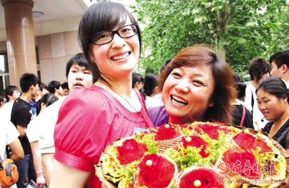 高考结束,不少学生和家长都松了一口气,进入了快乐的暑假生活。图为在泰山中学考点外,家长冯女士为女儿送上了鲜花。