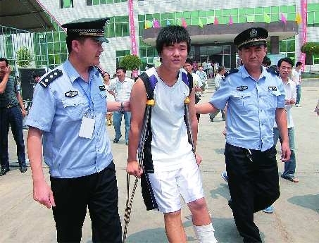 6月9日,在菏泽市第三中学高考点,民警搀扶一名手扶双拐的考生走出考场。今年高考期间,这名考生因左小腿骨折,行走非常不便,菏泽市公安局牡丹分局执勤民警主动上前帮忙。