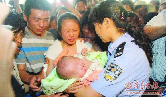 9日18时45分,民警将滕州市“6·7绑架婴儿案”中被抢男婴王硕安全解救出来,两名犯罪嫌疑人张恩华、张晶被抓获。图为民警把孩子送到父母手中。 本报通讯员 秦存超 摄
