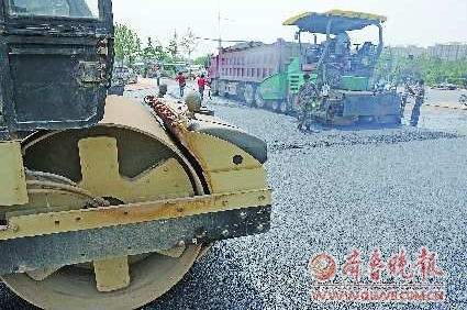 10日,济南西郊大金庄路口,铺路工人冒着高温铺设沥青,以便将经十西路和高铁济南西站连接起来。这项工程即将竣工,到时车辆可以通畅地进入高铁济南西站。