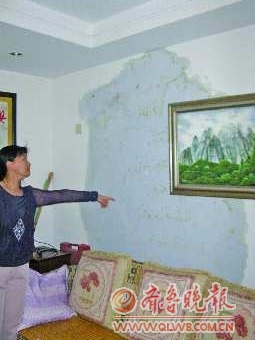 本报96706热线消息(记者 王倩) 家住金泉小区21号楼的10余户居民家遭了殃,不知谁家的太阳能上水管漏水,水顺着进气口流下,渗过墙皮湿了客厅的墙。水流到现在已经流了几天了,但是居民还没能查出是谁家的水管漏了,由于502家中没人,居民希望房主快点回家看看是否家中漏水。