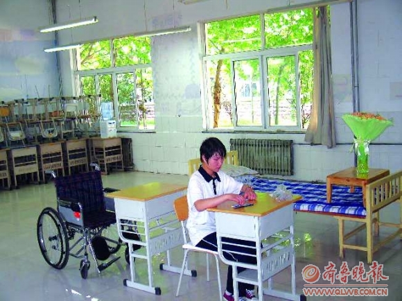 6月12日,济南市初三学业水平考试第一天,历城一中为一名考生布置了单独的考场。这名考生叫李杨,是仲宫镇中心中学学生,刚刚做完阑尾切除手术。经过中招办批准,学校为她启用了备用考场,并准备了随时可以休息的床和鲜花。 徐洁 李善庆 摄影报道