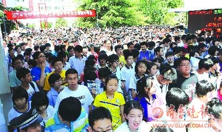 第一门考试快结束时,山师附中门口三面都已经堵满了家长,交警、巡警等十几名工作人员组成人墙站在众家长前。“给考生们让出一条路来。”现场已经被围得水泄不通,工作人员极力劝说着周围的陪考大军。这时走出考场的考生被眼前的景象惊呆了,很多人张大了嘴巴。在十几名工作人员努力下,这才挤出一条狭窄的小道。直到半个小时后的11时20分,考生才基本上全部离开考点。