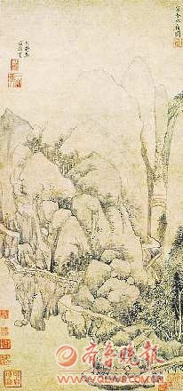 富春,是黄公望最喜爱和表现最多的山水题材。除了举世闻名的《富春山居图》外,他还有一幅题材相同的杰作———现藏南博的《富春大岭图轴》。此次“山水合璧特展”,既是《富春山居图》罹劫后首次合璧,也是《富春大岭图轴》与《富春山居图》第一次联合展出。《富春山居图》和《富春大岭图轴》题材都是描写富春山景色,但风格迥异。如果说《富春山居图》是黄公望画作中“笔势雄伟”的代表,那么,《富春大岭图轴》则是“皴纹极少,笔意简远”的典范。