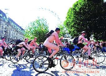 图为参加裸体骑行活动的人们经过伦敦市中心的摩天轮伦敦眼。