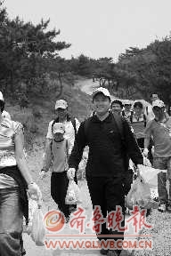 带队的男子叫王德洋,生于上个世纪60年代,是农行市南支行的一名工作人员。从2004年开始,王德洋利用周末时间,每周爬一次浮山,一边欣赏浮山美景,一边捡拾山间的垃圾。通过岛城某论坛,“环保哥”迅速蹿红。