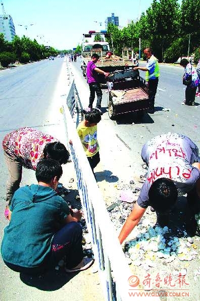 12日中午,在德州大学路上,一男子驾车与一辆送咸鸭蛋的三轮车相撞,送货男子受伤。三轮车上的咸鸭蛋散到马路上。附近一些居民趁处理事故的间隙,到马路中央抢蛋。 本报记者 王金强 董传同 摄 (线索提供者 张先生 奖励50元)