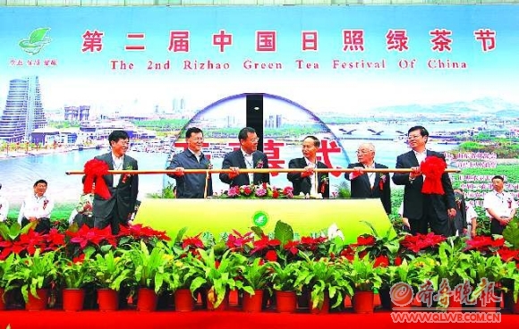 ▲6月10日,会展中心西广场,中国贸促会副会长张伟,中国茶叶流通协会会长刘环祥,前常驻联合国大使、中国驻美大使、九届全国人大华侨委员会副主任委员李道豫,日照市委书记、市人大常委会主任杨军,山东省贸促会会长刘方会,日照市委常委、常务副市长侯成君,共同推动开幕式启动杆。