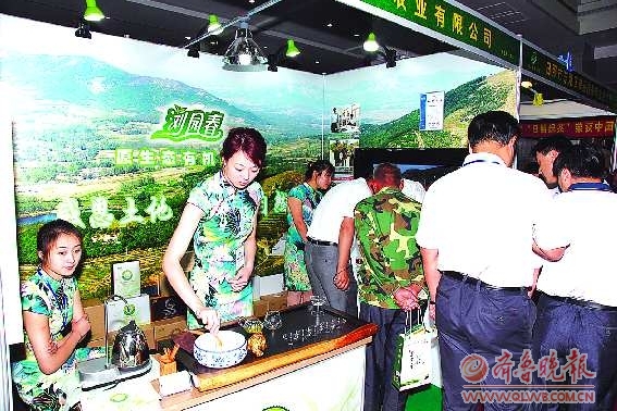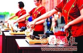 ▲会展中心展区内,礼仪人员为众市民备茶。