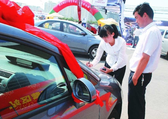 6月11日,2011年“走遍齐鲁———山东省30县区汽车巡展”上,一位汽车参展商的销售人员正为意向客户留下联系方式。据悉,由本报、大众网等单位主办的此次汽车巡展汇集了10余家汽车品牌,历时两天,吸引了不少消费者前来试驾、购买。