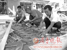 12日上午,在渤海七路黄河四路以北的马路旁边,记者看到几名工人正顶着烈日,按照各自的分工埋头工作。据悉,他们主要负责的是马路两边人行道的路面清理和地砖铺设工作。