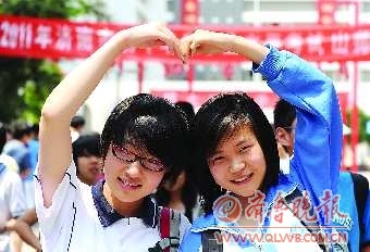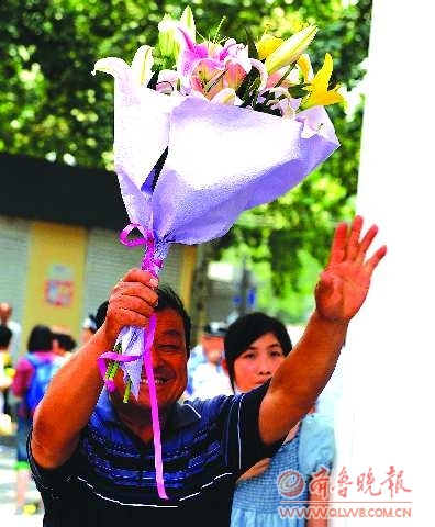 14日上午11点,济南初三学考结束。考生们在炽热的阳光下步出考场,迎接他们的是鲜花和掌声。