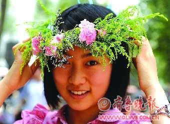 走出考场的刘雨晨戴上妈妈做的花环,满脸幸福。