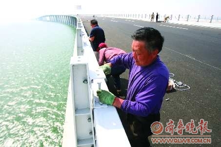14日,记者在海湾大桥上看到,工人正在安装防护栏。据介绍,大桥各项工作全部进入了收尾阶段,确保28日顺利通车。
