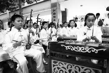 13日,在潍坊市幸福街小学,由50多名小学生组成的演奏队正在用古典乐器进行演奏。据学校的刘华杰老师介绍,学习古典乐器可以培养学生的耐性,并且能从古典乐器中学习中国古典文化知识,对学生的综合能力发展很有帮助。