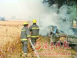 本报济宁6月14日热线消息(记者 陈鸿儒 通讯员 王志) 14日早上,泗水县星村镇一处麦田边的小路上,一辆农用货车突然起火,火势发展迅速,瞬间整个车头陷入火海。麦田尚未收割,如果火势蔓延,后果不堪设想。幸好泗水消防及时赶到现场扑救,未对麦田造成大的损失。
