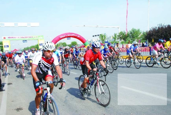 6月14日,全国公路自行车冠军赛(东营站)如期举行,图为自行车爱好者们在参加友谊赛。最终,吉林选手刘浩、山东选手梁敬分获男女个人计时赛冠军。