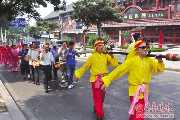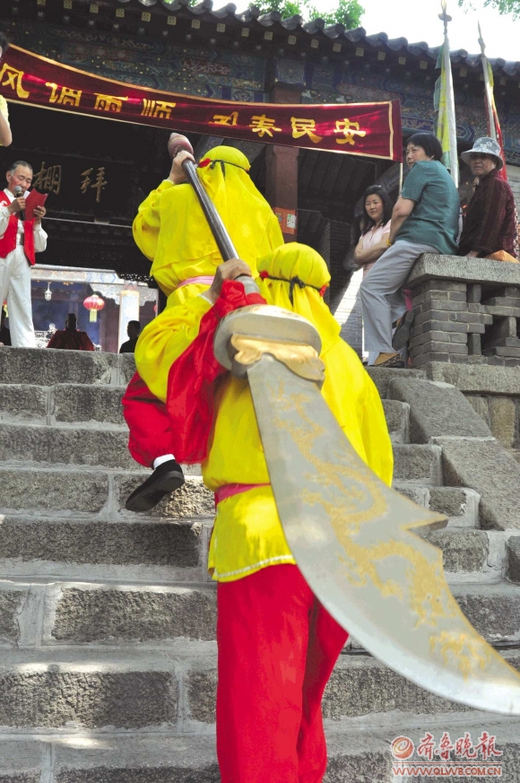 14日上午,在泰山景区红门管理区举行了关公诞辰1851周年的庆典活动。由普通老百姓组成的庆典队伍将关公重达83斤的“青龙偃月刀”奉上,以此祈求风调雨顺、国泰民安。图为庆典队伍的两名成员肩扛“青龙偃月刀”。本报见习记者 赵苏炜 王世腾 摄