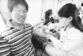 6月14日是世界献血者日,聊城市中心血站在百货大楼路口开展无偿献血活动,并向献血者赠送纪念品,当日共510名市民献血,共采集血液20.4万毫升。本报记者 李军 摄影报道