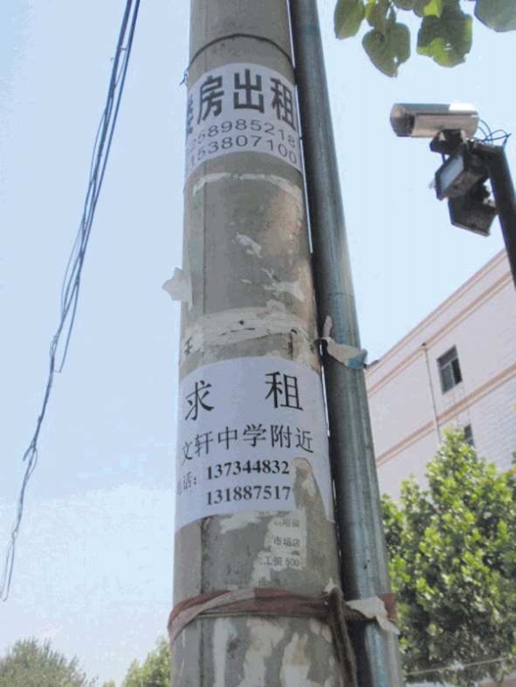 在文轩中学周围的多个小区,都张贴着很多求租、出租的小广告,有的广告联系方式直接被撕走了。