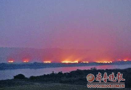 15日晚7时45分,记者驱车自南外环运河大桥处出发,沿运河东岸的滨湖大道向北行驶,这时天还没全黑,天空中显得雾蒙蒙的,空气中隐约能闻到一些燃烧的刺鼻气味。8点左右,记者来到太白楼西路还未通车的运河大桥附近,发现运河西边大桥南侧约200米处岸边的田地里,两个火头正在缓慢燃烧,一股股轻烟飘起,向周围散去。
