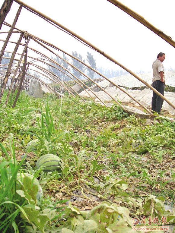 良庄镇瓜农薛其利和妻子在大棚前正准备灌溉后期补种的豆角等作物,沾满粉尘的头发掩盖不住他一脸的无奈。薛其利告诉记者,他今年种植了两个大棚的西瓜,总共能产西瓜一万多斤,但是今年却没有卖出好价钱。“前两年,西瓜收购价格都到了一块四一斤,今年西瓜的收购价才6毛钱,连往年价格的一半都不到。”薛其利无奈地说。