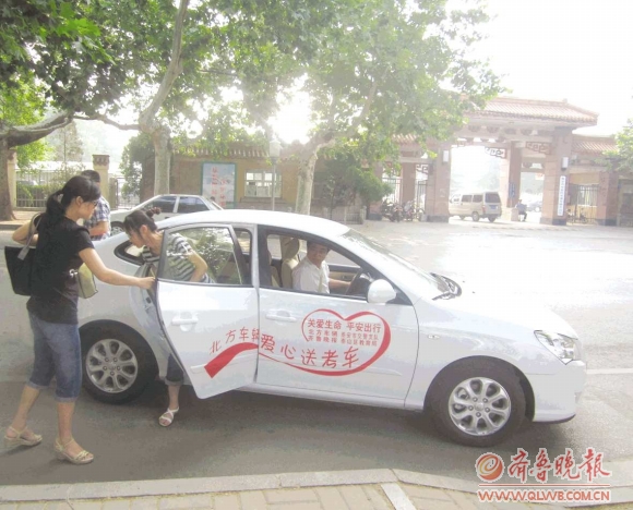 6月7日,高考考生乘座泰安北方车辆公司的爱心送考车到达一中考点。 本报见习记者 白雪 摄