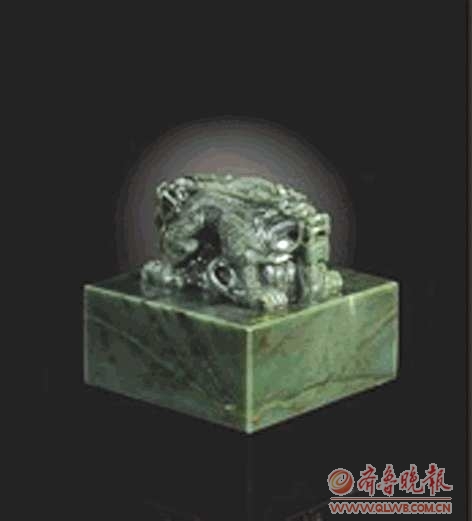 青玉质,交龙钮,印面正方形,汉文篆书“天恩八旬之宝”六字,阳文。尺寸12.7×12.7cm。香港苏富比2008年秋拍,成交价格RMB16,350,400元。