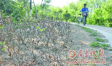 6月16日,日照市银河公园内有的绿化带的苗木已经枯死。
